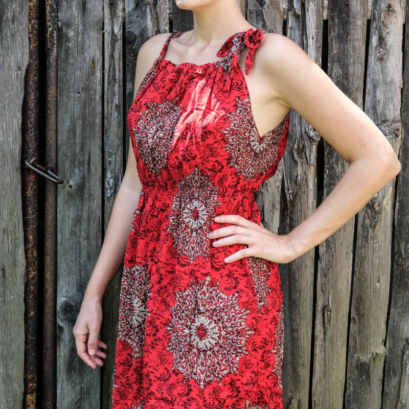 V pase se nachází pružná guma, která se přizpůsobí všem velikostem (od XS - M). Pomocí variabilního látkového zavazování okolo krku si můžete nastavit velikost na míru přesně podle své postavy, a navíc zavázat na místě, kde se vám to zrovna bude líbit (vpravo, vlevo, nahoře, dole, vzadu nebo vpředu). Na šatech můžete a nemusíte mít i decentní výstřih, který si sami nastavíte. Na barvách a nápaditosti motivů se nešetří, šaty hýří pestrou paletou barev a také přírodními materiály jako je bavlna. Šaty kolem sebe šíří pozitivní energii a dobrou náladu, určitě je oceníte v horkých letních dnech. Střih je uzpůsoben každé postavě.
