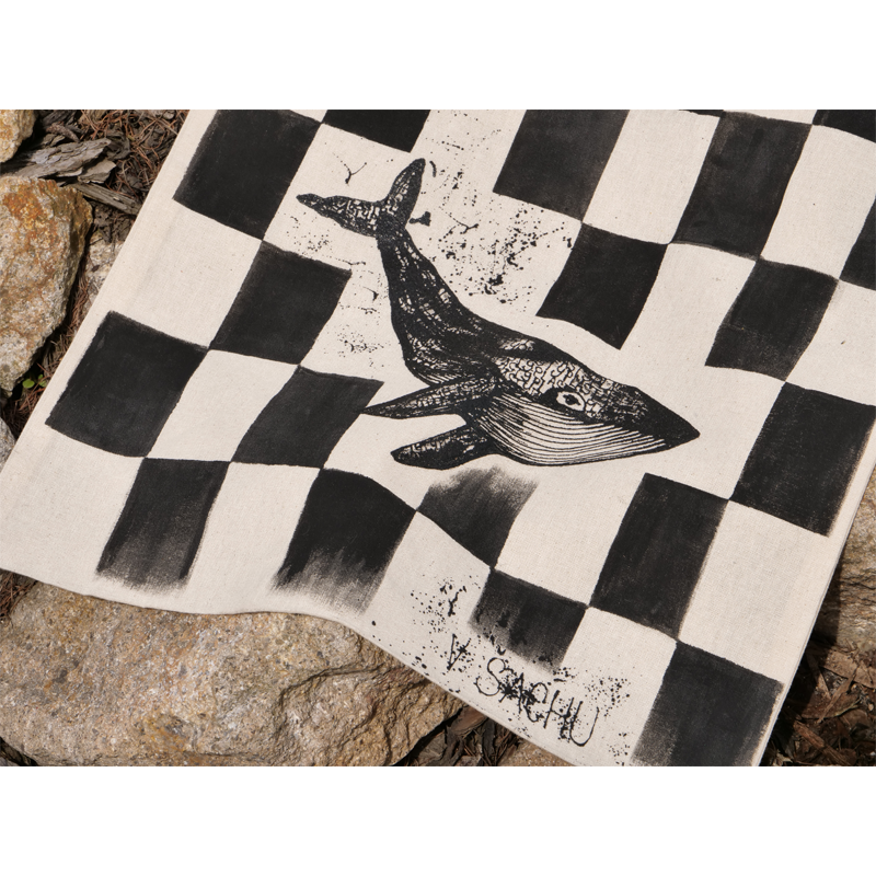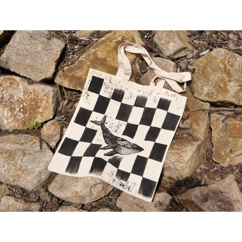 Plátěná eco taška s malovaným originálním motivem - Velryba v šachu
