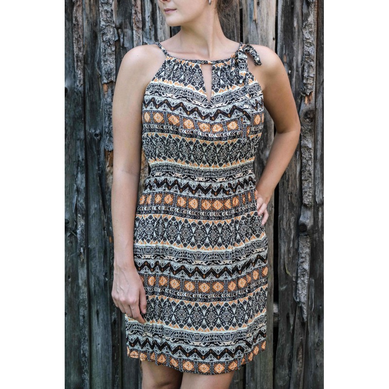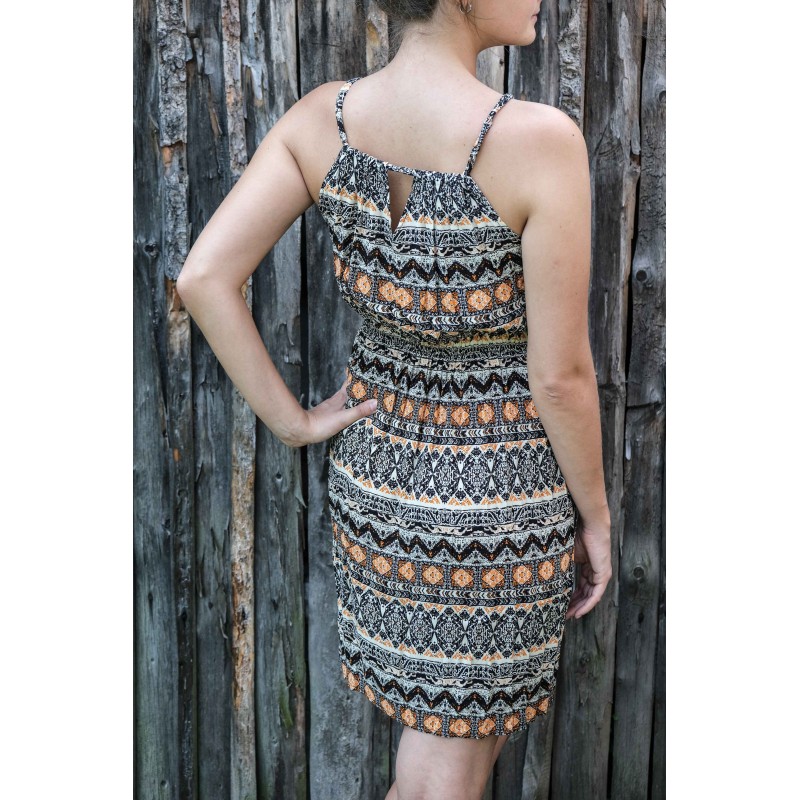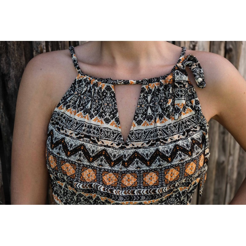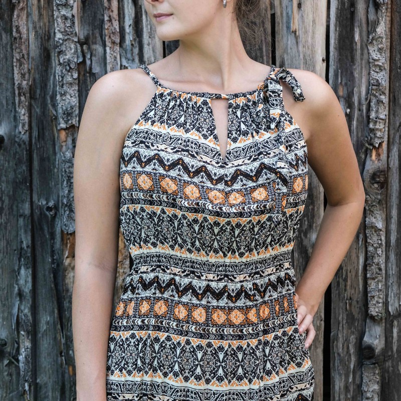 V pase se nachází pružná guma, která se přizpůsobí všem velikostem (od XS - M). Pomocí variabilního látkového zavazování okolo krku si můžete nastavit velikost na míru přesně podle své postavy, a navíc zavázat na místě, kde se vám to zrovna bude líbit (vpravo, vlevo, nahoře, dole, vzadu nebo vpředu). Na šatech můžete a nemusíte mít i decentní výstřih, který si sami nastavíte. Na barvách a nápaditosti motivů se nešetří, šaty hýří pestrou paletou barev a také přírodními materiály jako je bavlna. Šaty kolem sebe šíří pozitivní energii a dobrou náladu, určitě je oceníte v horkých letních dnech. Střih je uzpůsoben každé postavě.