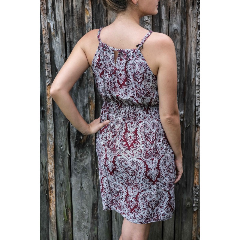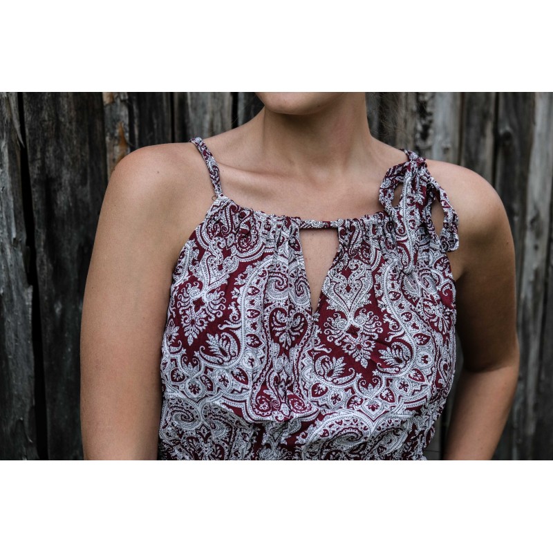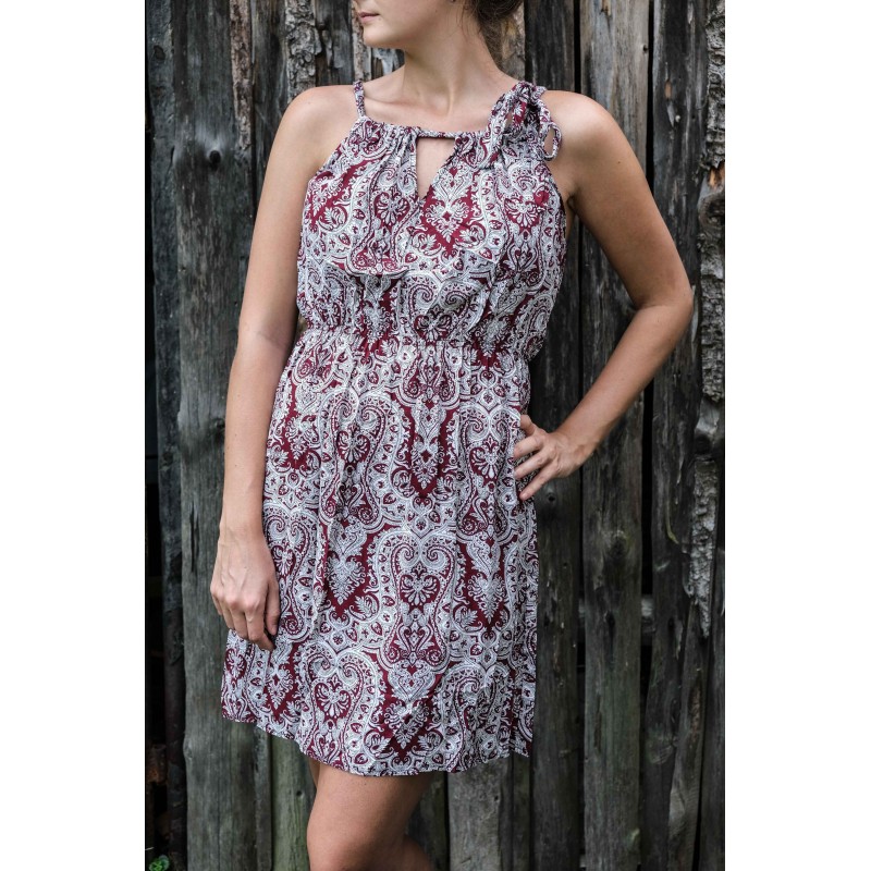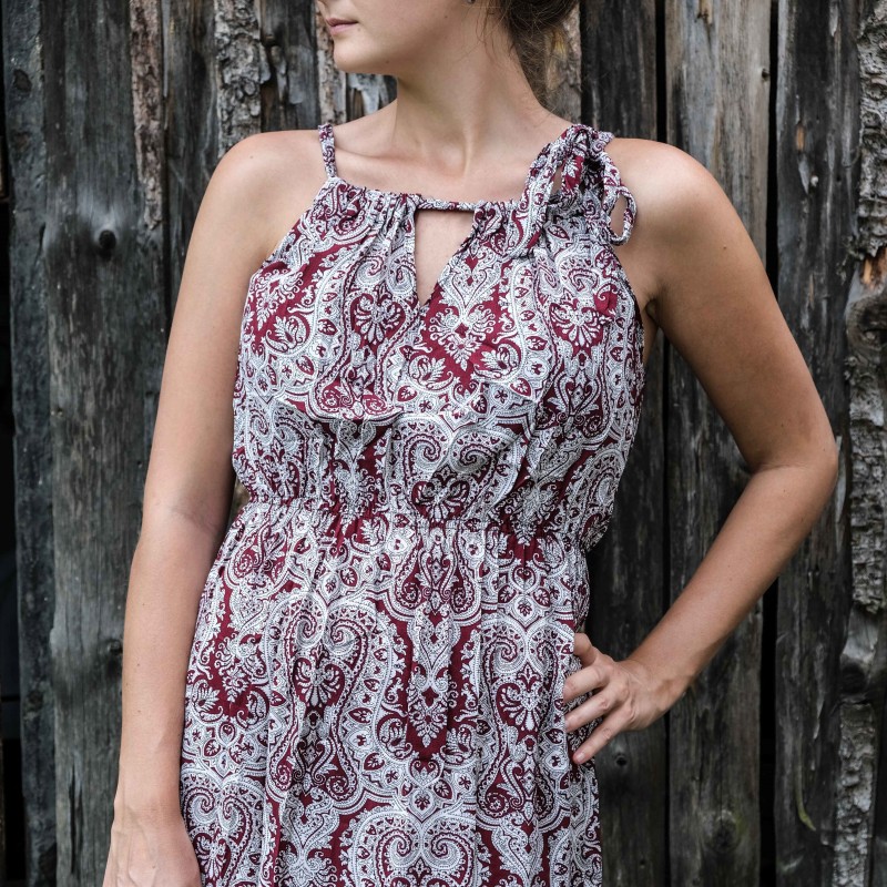 V pase se nachází pružná guma, která se přizpůsobí všem velikostem (od XS - M). Pomocí variabilního látkového zavazování okolo krku si můžete nastavit velikost na míru přesně podle své postavy, a navíc zavázat na místě, kde se vám to zrovna bude líbit (vpravo, vlevo, nahoře, dole, vzadu nebo vpředu). Na šatech můžete a nemusíte mít i decentní výstřih, který si sami nastavíte. Na barvách a nápaditosti motivů se nešetří, šaty hýří pestrou paletou barev a také přírodními materiály jako je bavlna. Šaty kolem sebe šíří pozitivní energii a dobrou náladu, určitě je oceníte v horkých letních dnech. Střih je uzpůsoben každé postavě.