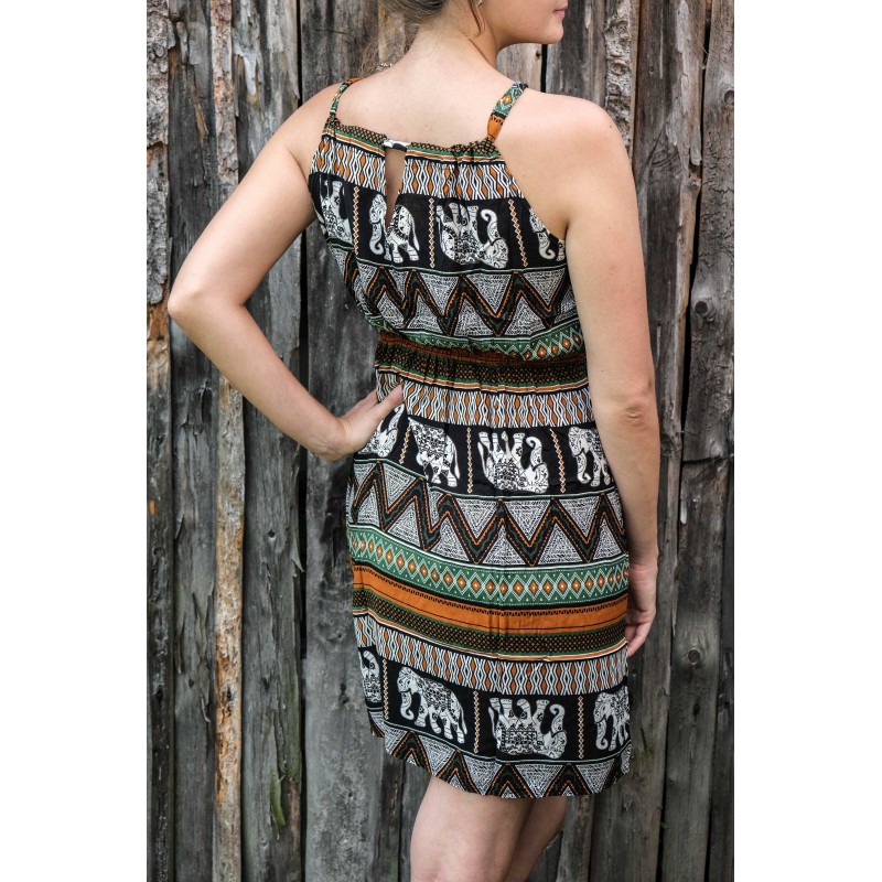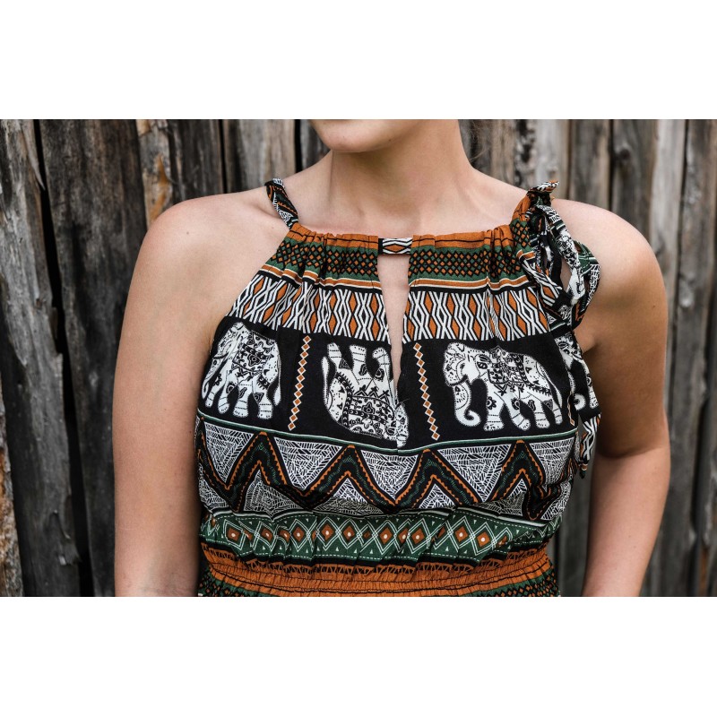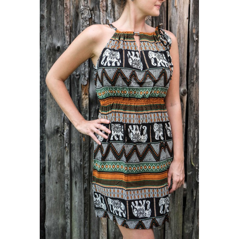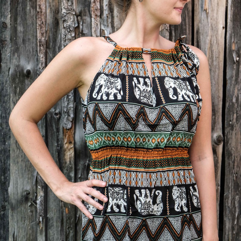 V pase se nachází pružná guma, která se přizpůsobí všem velikostem (od XS - M). Pomocí variabilního látkového zavazování okolo krku si můžete nastavit velikost na míru přesně podle své postavy, a navíc zavázat na místě, kde se vám to zrovna bude líbit (vpravo, vlevo, nahoře, dole, vzadu nebo vpředu). Na šatech můžete a nemusíte mít i decentní výstřih, který si sami nastavíte. Na barvách a nápaditosti motivů se nešetří, šaty hýří pestrou paletou barev a také přírodními materiály jako je bavlna. Šaty kolem sebe šíří pozitivní energii a dobrou náladu, určitě je oceníte v horkých letních dnech. Střih je uzpůsoben každé postavě.