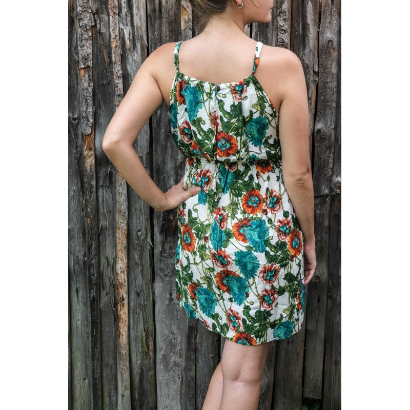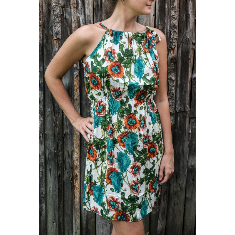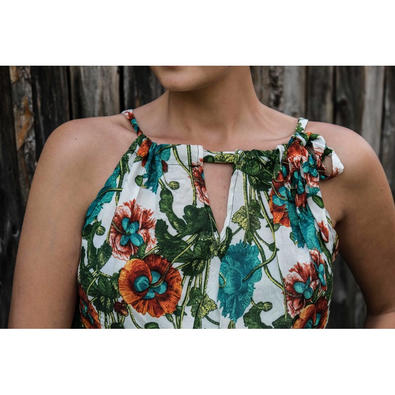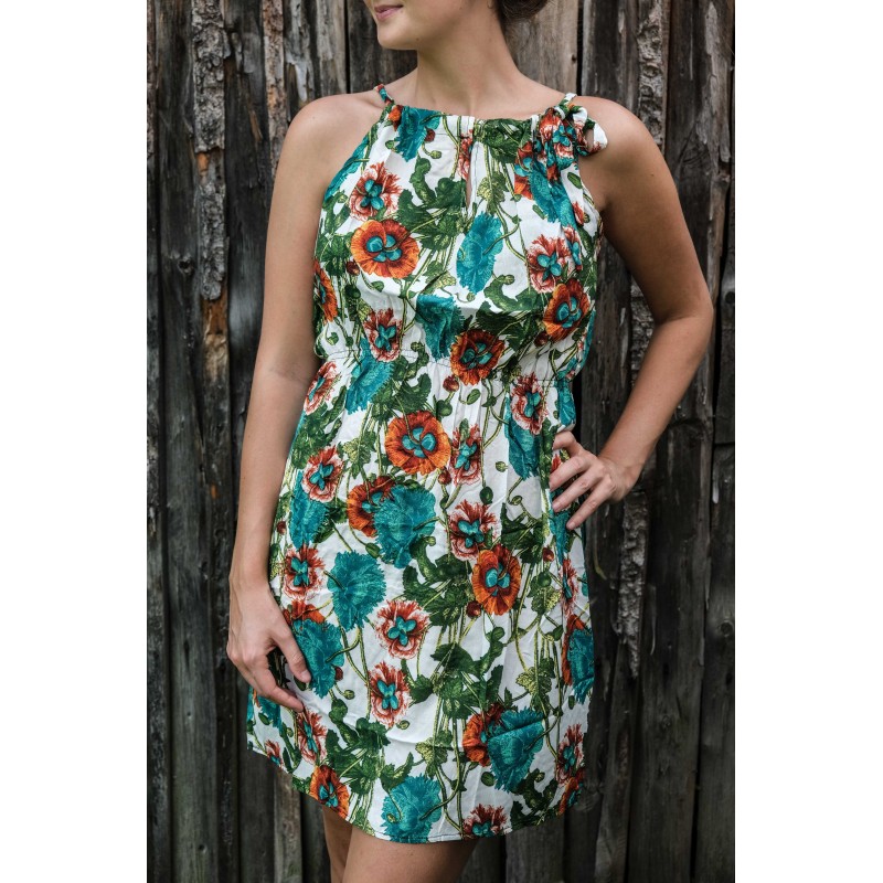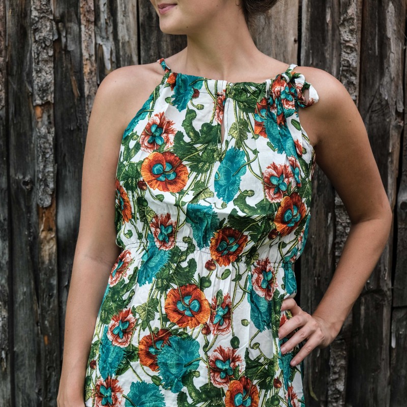 V pase se nachází pružná guma, která se přizpůsobí všem velikostem (od XS - M). Pomocí variabilního látkového zavazování okolo krku si můžete nastavit velikost na míru přesně podle své postavy, a navíc zavázat na místě, kde se vám to zrovna bude líbit (vpravo, vlevo, nahoře, dole, vzadu nebo vpředu). Na šatech můžete a nemusíte mít i decentní výstřih, který si sami nastavíte. Na barvách a nápaditosti motivů se nešetří, šaty hýří pestrou paletou barev a také přírodními materiály jako je bavlna. Šaty kolem sebe šíří pozitivní energii a dobrou náladu, určitě je oceníte v horkých letních dnech. Střih je uzpůsoben každé postavě.