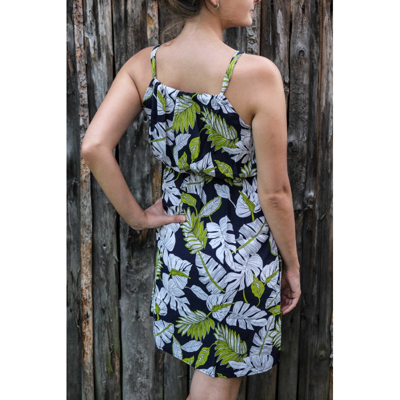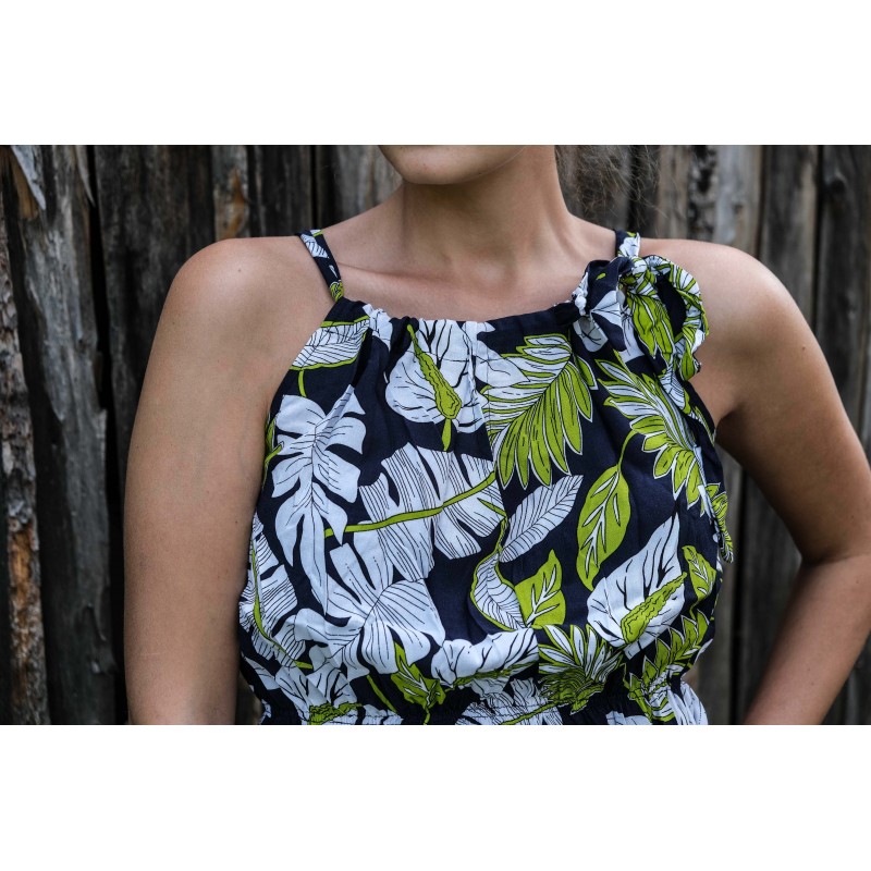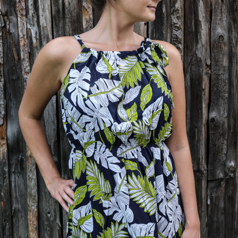 V pase se nachází pružná guma, která se přizpůsobí všem velikostem (od XS - M). Pomocí variabilního látkového zavazování okolo krku si můžete nastavit velikost na míru přesně podle své postavy, a navíc zavázat na místě, kde se vám to zrovna bude líbit (vpravo, vlevo, nahoře, dole, vzadu nebo vpředu). Na šatech můžete a nemusíte mít i decentní výstřih, který si sami nastavíte. Na barvách a nápaditosti motivů se nešetří, šaty hýří pestrou paletou barev a také přírodními materiály jako je bavlna. Šaty kolem sebe šíří pozitivní energii a dobrou náladu, určitě je oceníte v horkých letních dnech. Střih je uzpůsoben každé postavě.