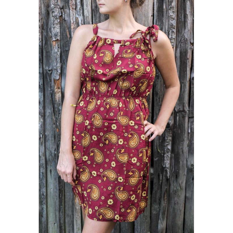V pase se nachází pružná guma, která se přizpůsobí všem velikostem (od XS - M). Pomocí variabilního látkového zavazování okolo krku si můžete nastavit velikost na míru přesně podle své postavy, a navíc zavázat na místě, kde se vám to zrovna bude líbit (vpravo, vlevo, nahoře, dole, vzadu nebo vpředu). Na šatech můžete a nemusíte mít i decentní výstřih, který si sami nastavíte. Na barvách a nápaditosti motivů se nešetří, šaty hýří pestrou paletou barev a také přírodními materiály jako je bavlna. Šaty kolem sebe šíří pozitivní energii a dobrou náladu, určitě je oceníte v horkých letních dnech. Střih je uzpůsoben každé postavě.
