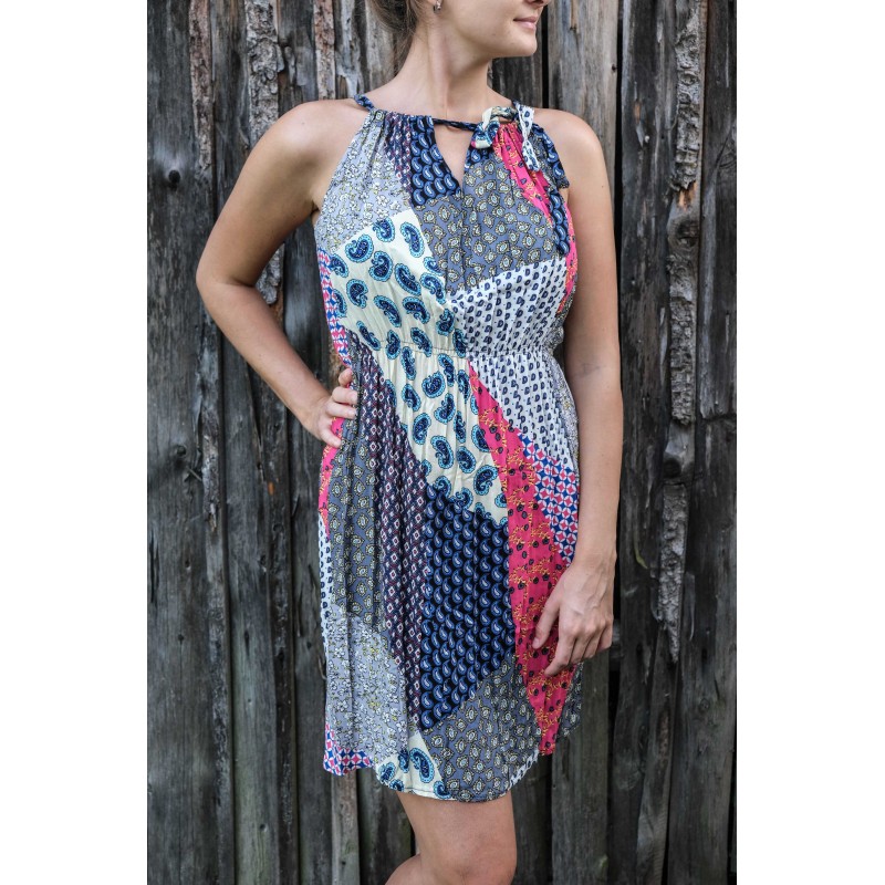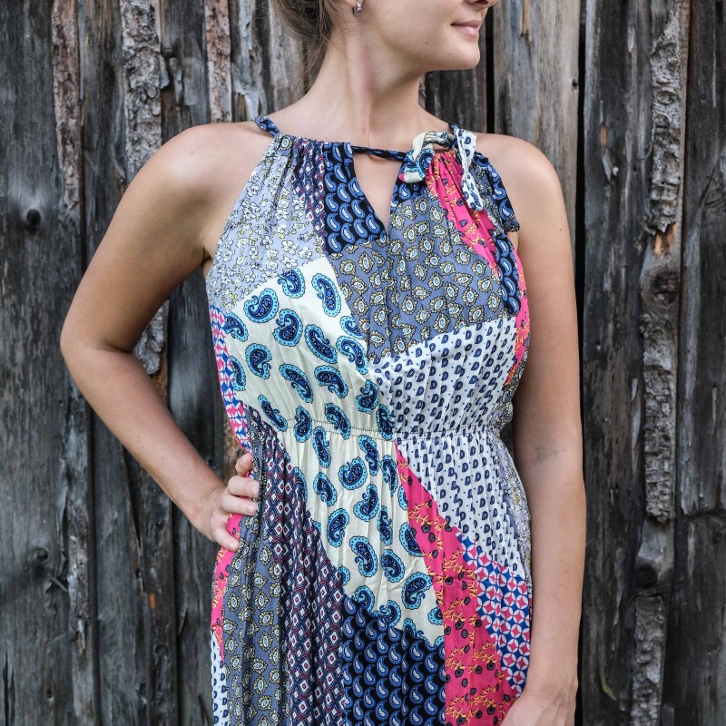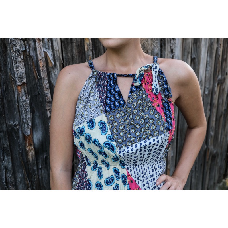 V pase se nachází pružná guma, která se přizpůsobí všem velikostem (od XS - M). Pomocí variabilního látkového zavazování okolo krku si můžete nastavit velikost na míru přesně podle své postavy, a navíc zavázat na místě, kde se vám to zrovna bude líbit (vpravo, vlevo, nahoře, dole, vzadu nebo vpředu). Na šatech můžete a nemusíte mít i decentní výstřih, který si sami nastavíte. Na barvách a nápaditosti motivů se nešetří, šaty hýří pestrou paletou barev a také přírodními materiály jako je bavlna. Šaty kolem sebe šíří pozitivní energii a dobrou náladu, určitě je oceníte v horkých letních dnech. Střih je uzpůsoben každé postavě.