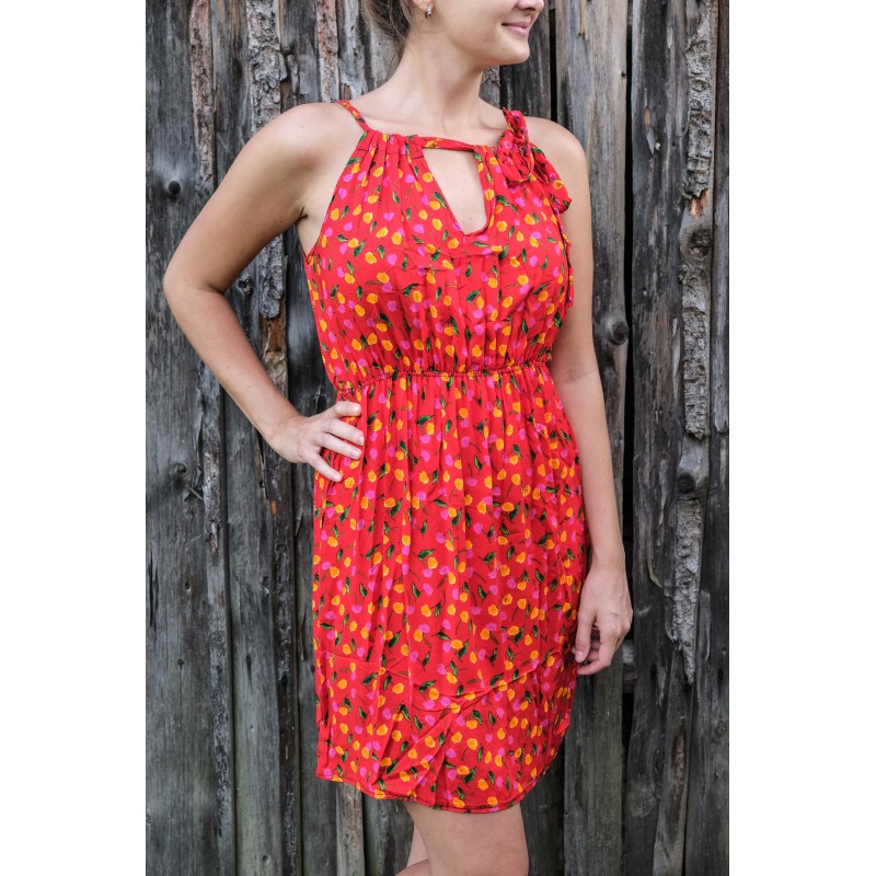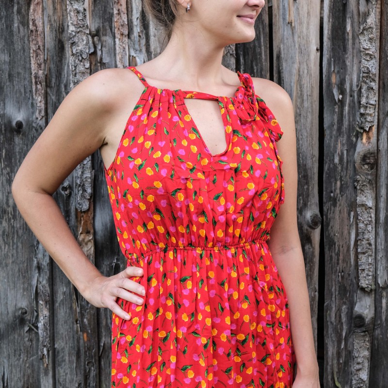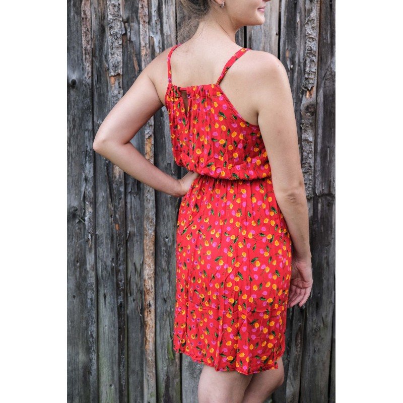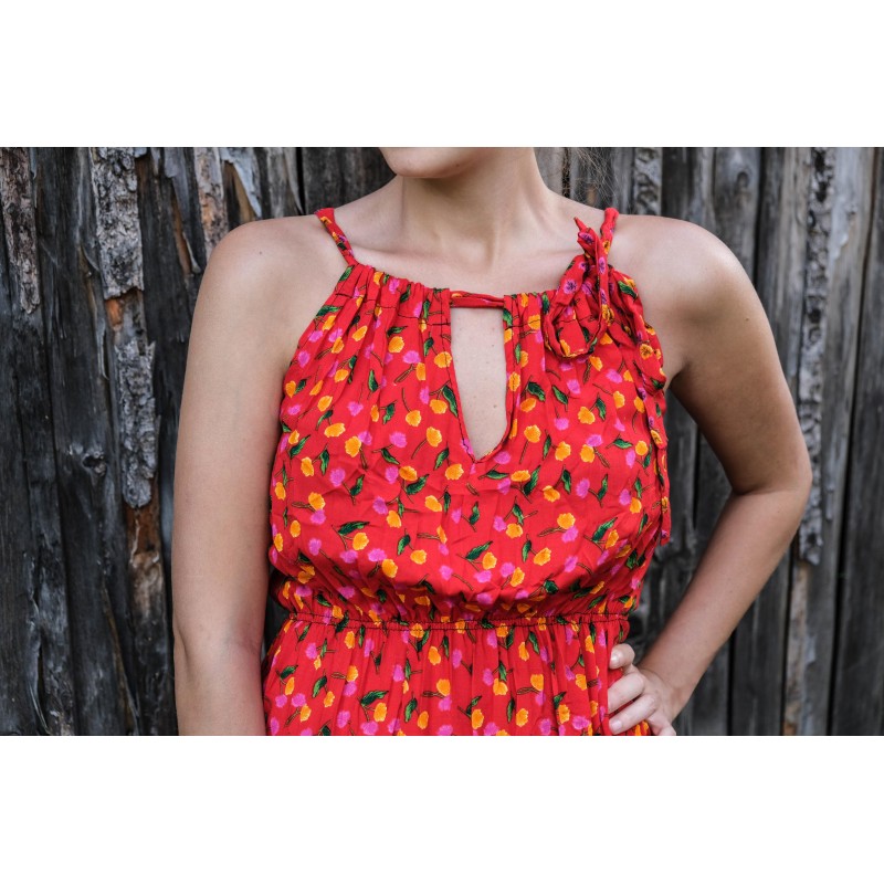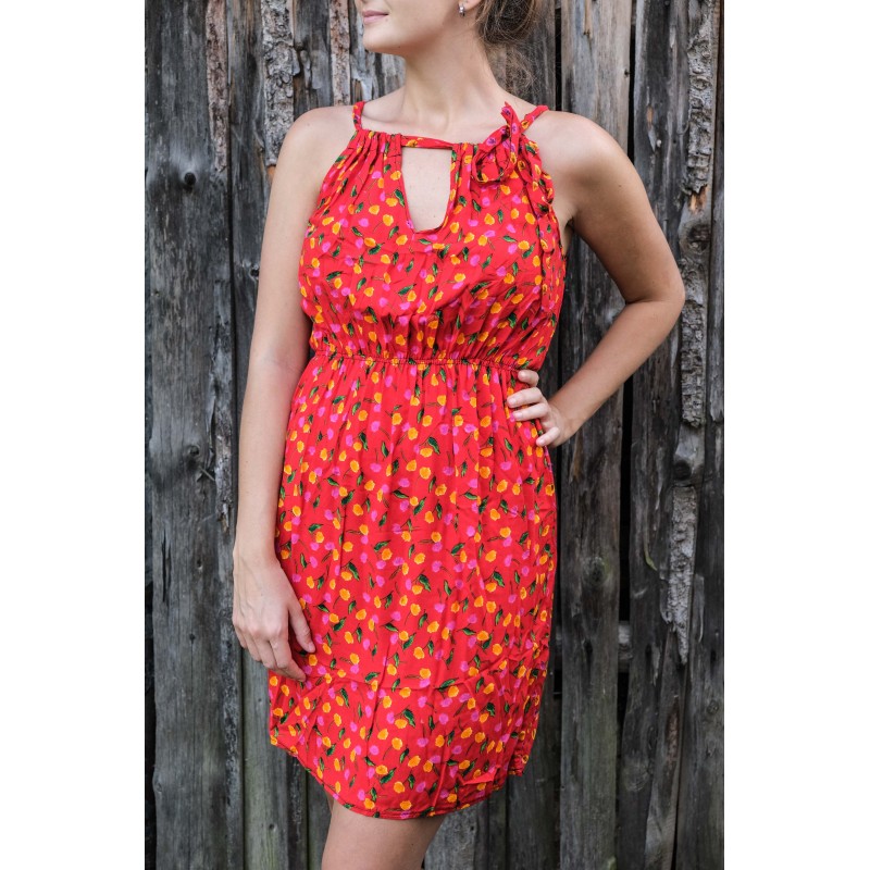 V pase se nachází pružná guma, která se přizpůsobí všem velikostem (od XS - M). Pomocí variabilního látkového zavazování okolo krku si můžete nastavit velikost na míru přesně podle své postavy, a navíc zavázat na místě, kde se vám to zrovna bude líbit (vpravo, vlevo, nahoře, dole, vzadu nebo vpředu). Na šatech můžete a nemusíte mít i decentní výstřih, který si sami nastavíte. Na barvách a nápaditosti motivů se nešetří, šaty hýří pestrou paletou barev a také přírodními materiály jako je bavlna. Šaty kolem sebe šíří pozitivní energii a dobrou náladu, určitě je oceníte v horkých letních dnech. Střih je uzpůsoben každé postavě.