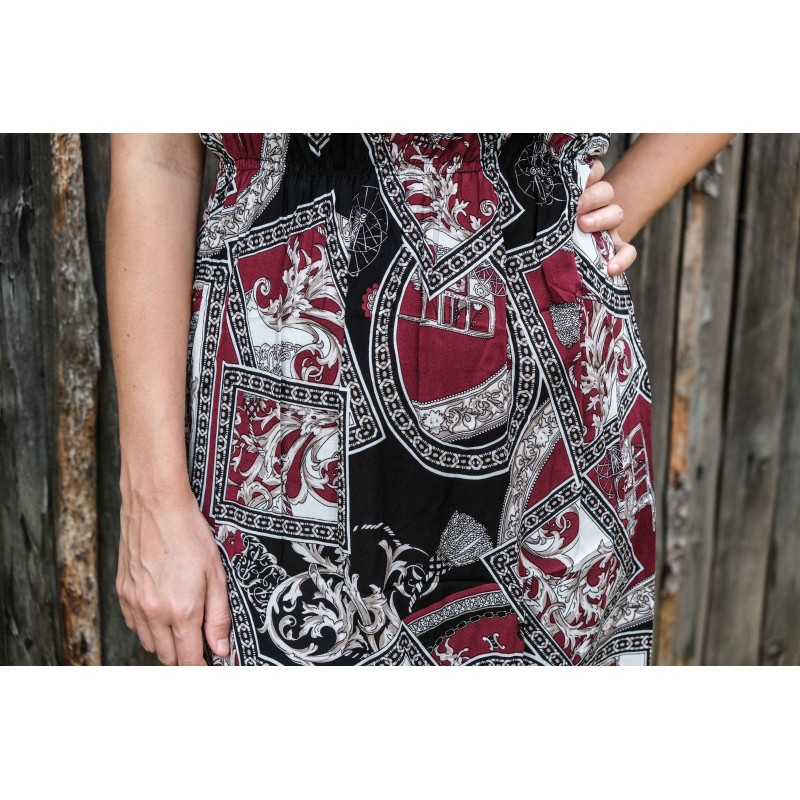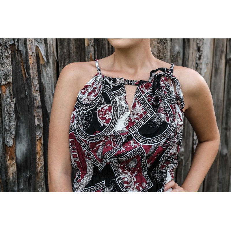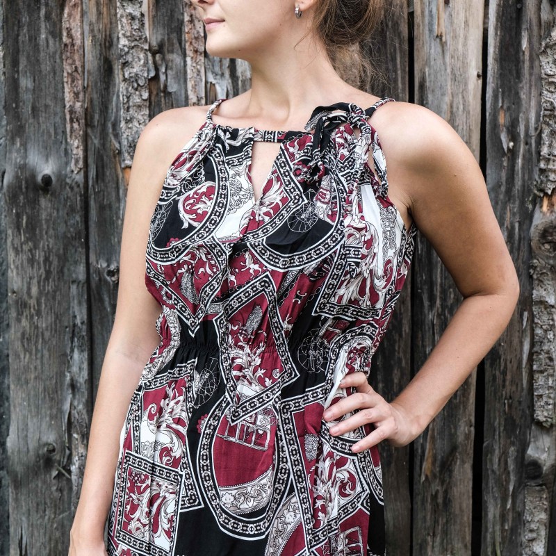 V pase se nachází pružná guma, která se přizpůsobí všem velikostem (od XS - M). Pomocí variabilního látkového zavazování okolo krku si můžete nastavit velikost na míru přesně podle své postavy, a navíc zavázat na místě, kde se vám to zrovna bude líbit (vpravo, vlevo, nahoře, dole, vzadu nebo vpředu). Na šatech můžete a nemusíte mít i decentní výstřih, který si sami nastavíte. Na barvách a nápaditosti motivů se nešetří, šaty hýří pestrou paletou barev a také přírodními materiály jako je bavlna. Šaty kolem sebe šíří pozitivní energii a dobrou náladu, určitě je oceníte v horkých letních dnech. Střih je uzpůsoben každé postavě.