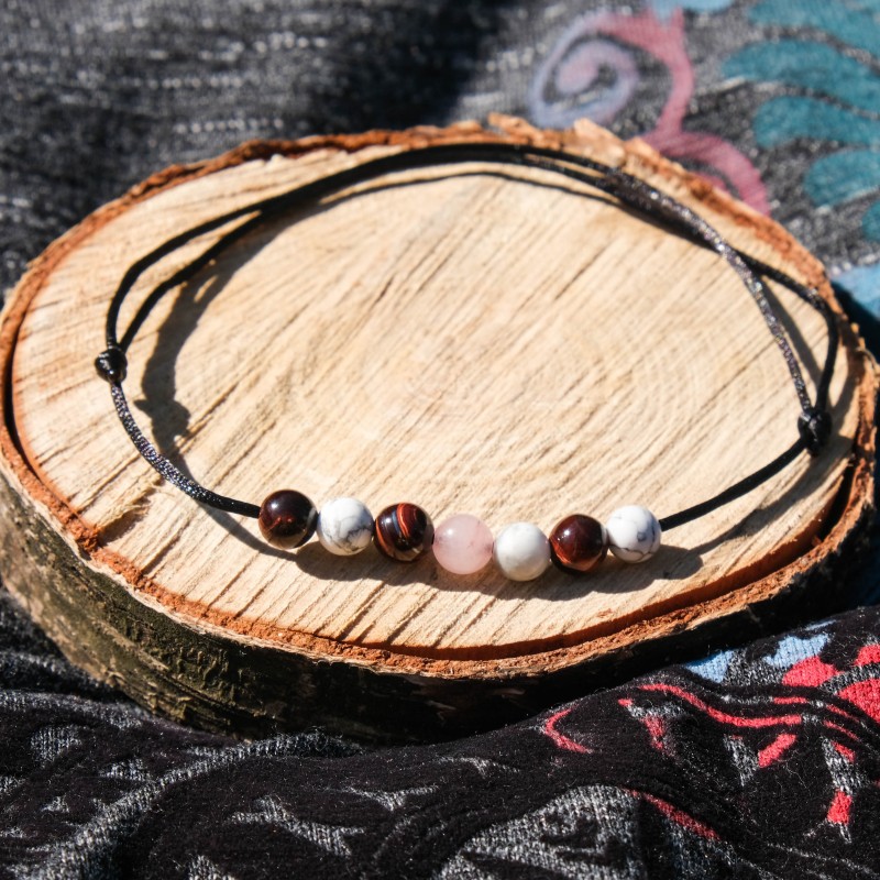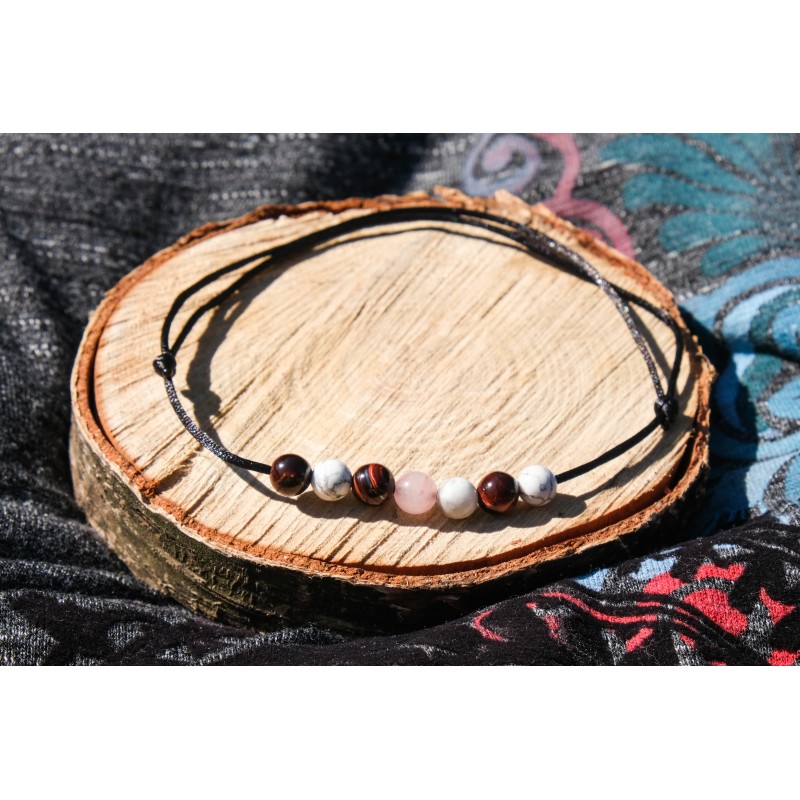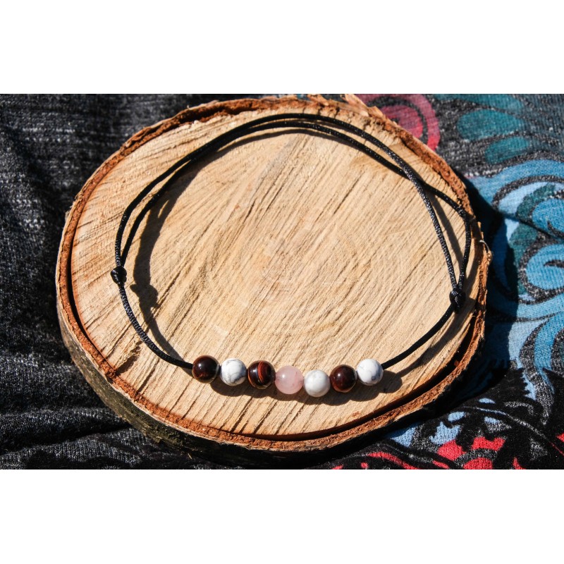 Jedná se o jemný šperk z přírodních materiálů. Náramek je možné nastavit na jakýkoli obvod zápěstí. Kamínky jsou navlečeny na saténovém vlákně černé barvy.