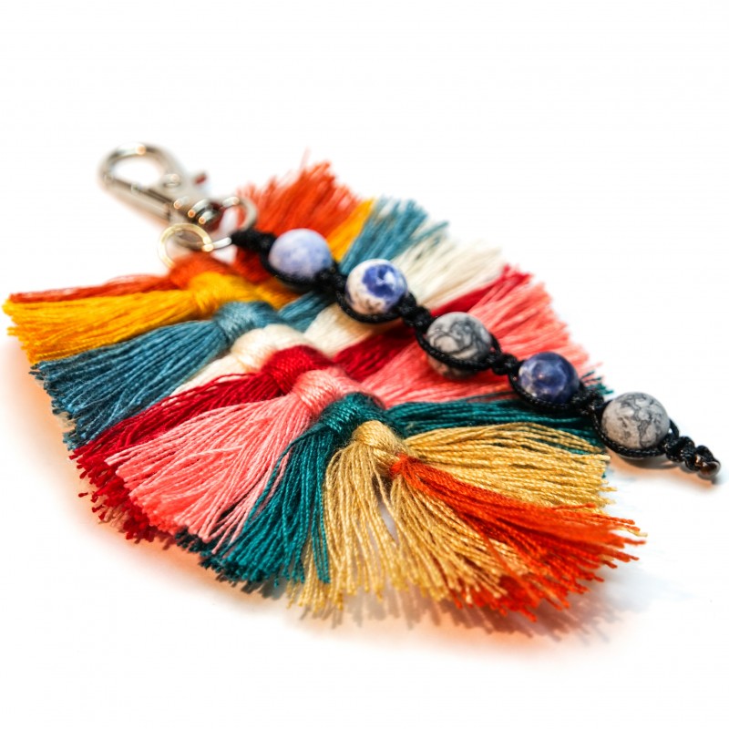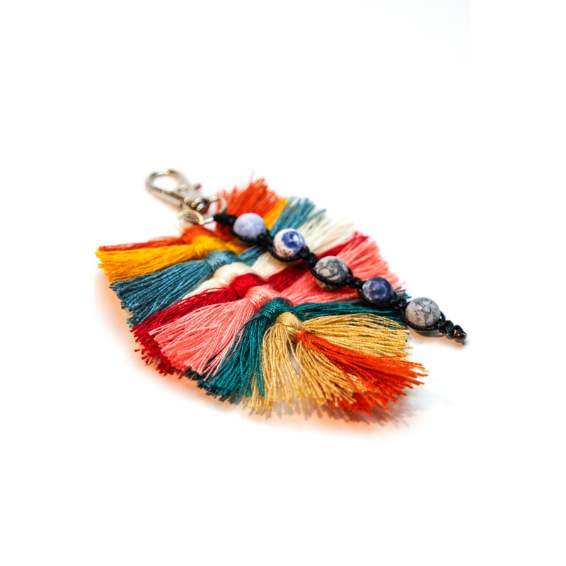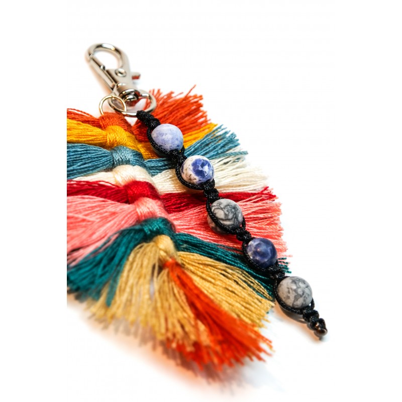 Jedná se o jemný přívěsek z minerálních kamenů a vyšívací příze, stylový a přesto praktický. Precizně vyrobený minerální přívěsek je ukázkovým příkladem toho, jak moc na detailech záleží. Přívěsek je zapleten přímo na karabince, pomocí které se připne na klíče, batoh nebo kabelku.
