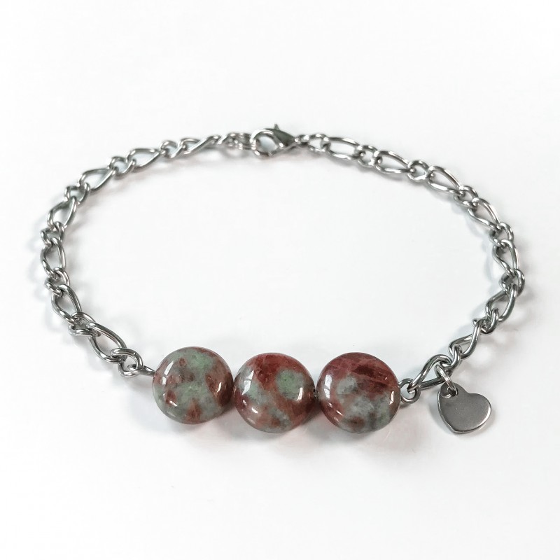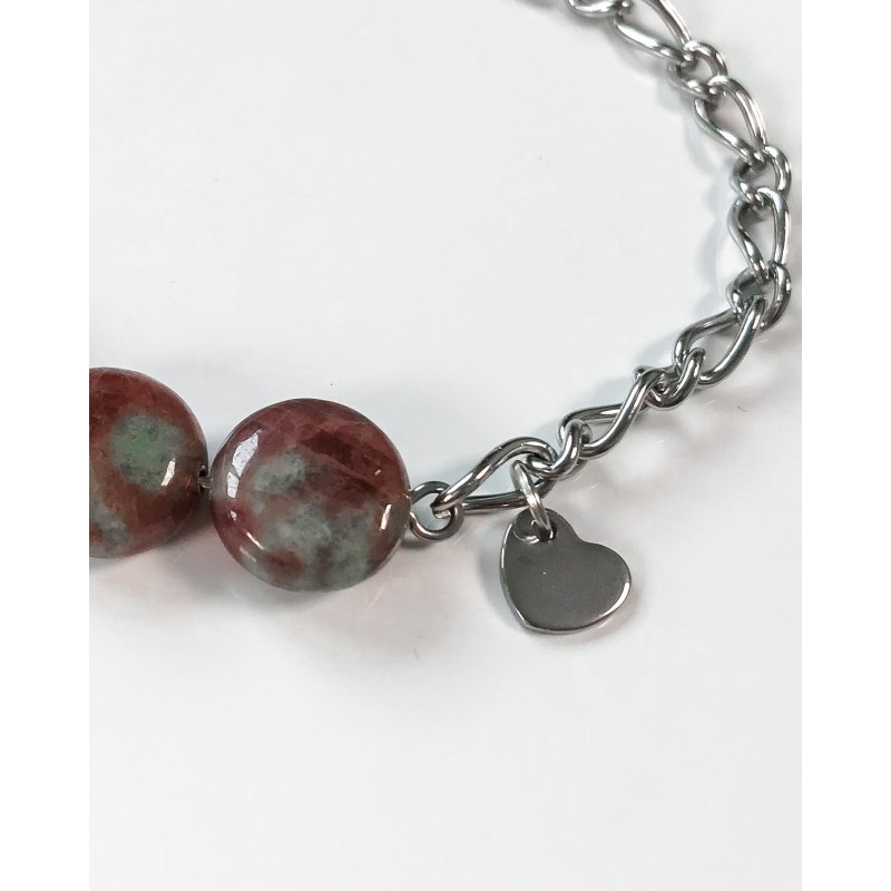 Jedná se o jemný elegantní šperk z minerálních kamenů v kombinaci s řetízkem z chirurgické oceli, stylový a přesto praktický. Chirurgická ocel 316L je velmi oblíbená pro svou tvrdost, stálobarevnost a především pro své hypoalergenní vlastnosti. Precizně vyrobený minerální náramek je ukázkovým příkladem toho, jak moc na detailech záleží. Náramek je flexibilní, je možné ho zapnout na libovolný obvod pod 18,5 cm.