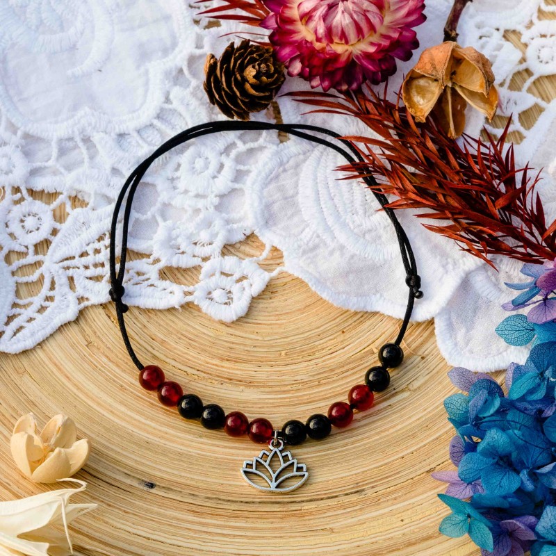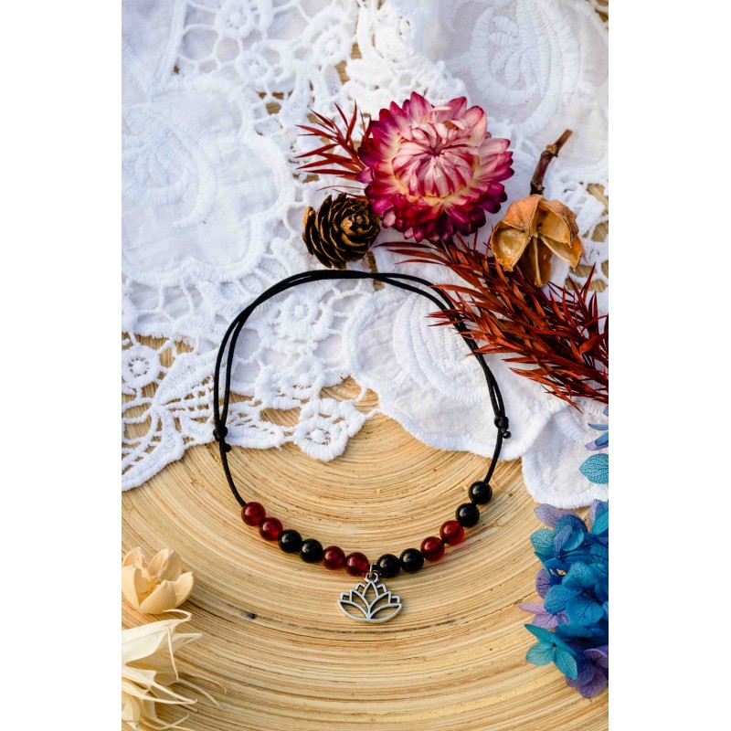 Jedná se o jemný šperk z přírodních materiálů. Náramek je možné nastavit na různý obvod kotníku. Kamínky jsou navlečeny na saténovém vlákně černé barvy.