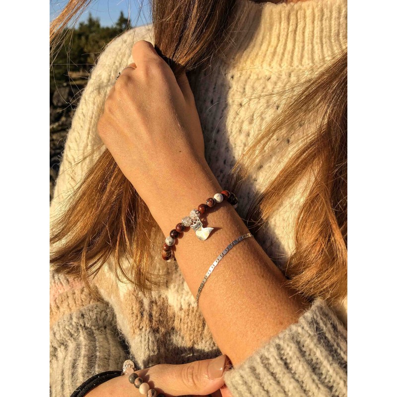 Minerály: leopardí jaspis, křišťál, howlit, hematit