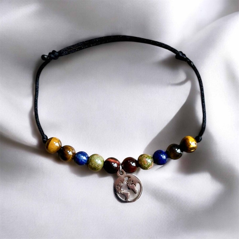 Jedná se o jemný šperk z přírodních materiálů. Náramek je možné nastavit na jakýkoli obvod zápěstí (do 27 cm). Kamínky jsou navlečeny na saténovém vlákně černé barvy.