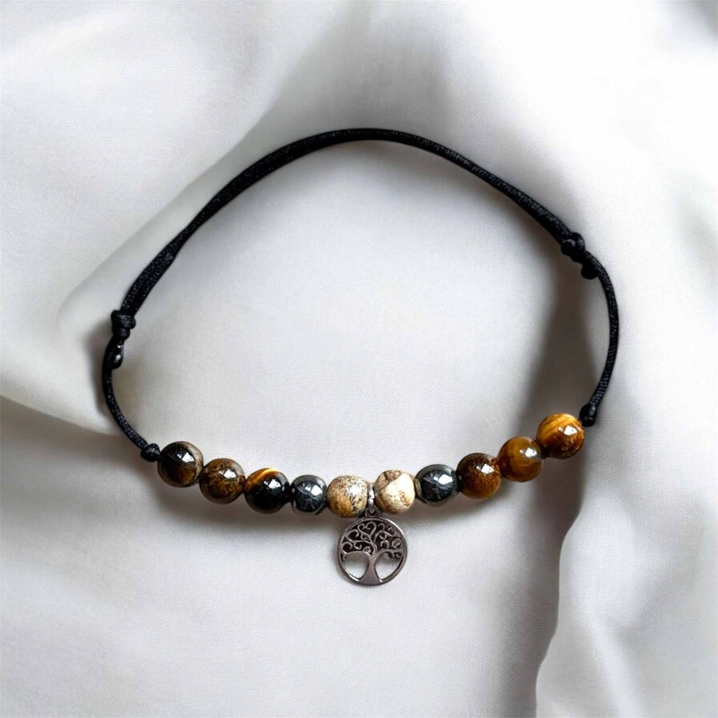 Jedná se o jemný šperk z přírodních materiálů. Náramek je možné nastavit na jakýkoli obvod zápěstí (do 27 cm). Kamínky jsou navlečeny na saténovém vlákně černé barvy.