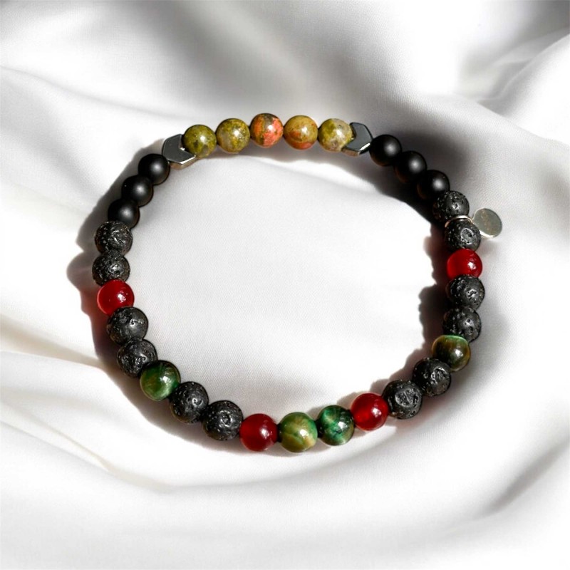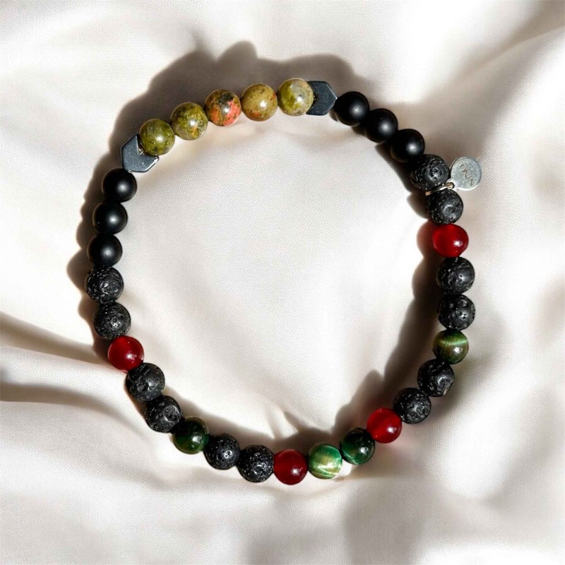 Minerály: lávový kámen, unakit, tygří oko (zelené), jantar (červený), onyx, hematit