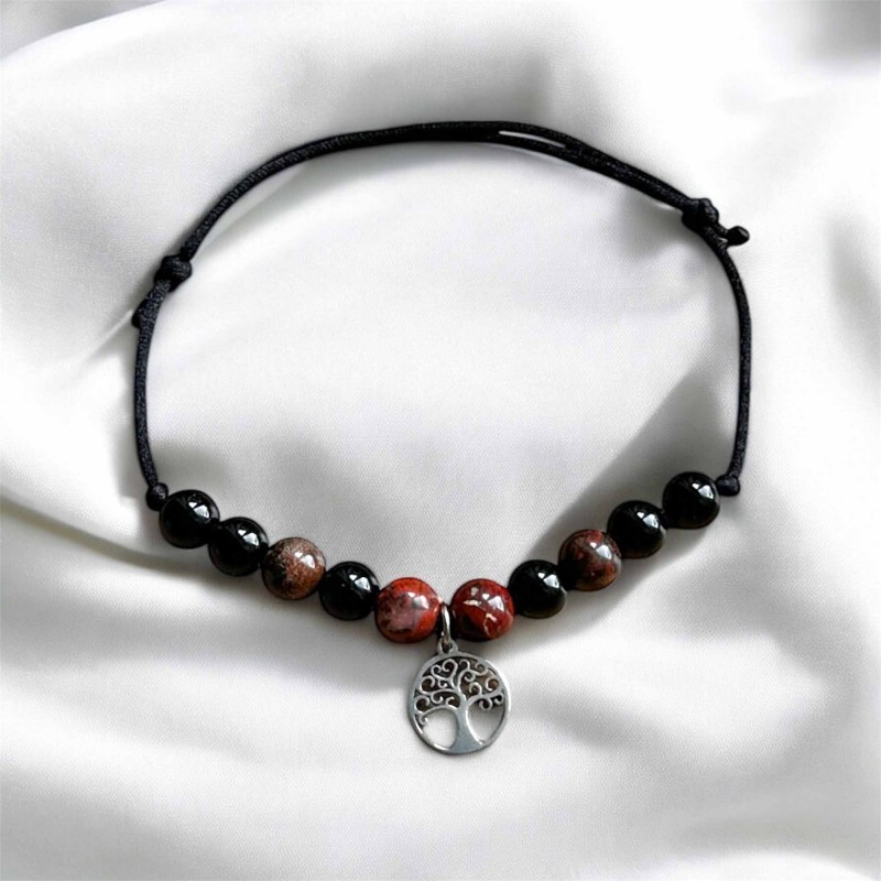 Jedná se o jemný šperk z přírodních materiálů. Náramek je možné nastavit na jakýkoli obvod zápěstí (do 27 cm). Kamínky jsou navlečeny na saténovém vlákně černé barvy.