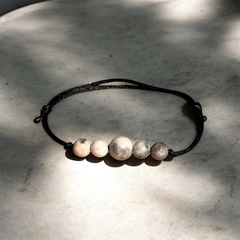 Jedná se o jemný šperk z přírodních materiálů. Náramek je možné nastavit na jakýkoli obvod zápěstí (do 27 cm). Kamínky jsou navlečeny na saténovém vlákně černé barvy.