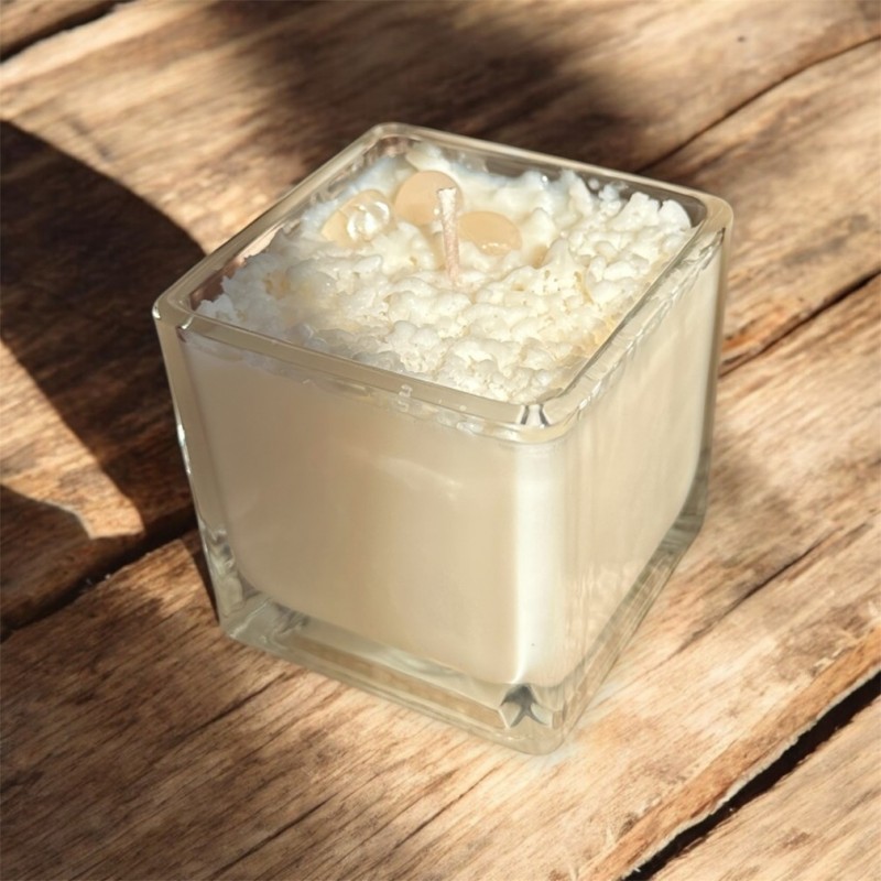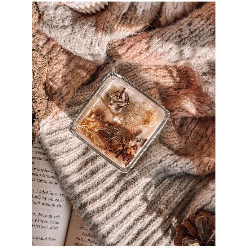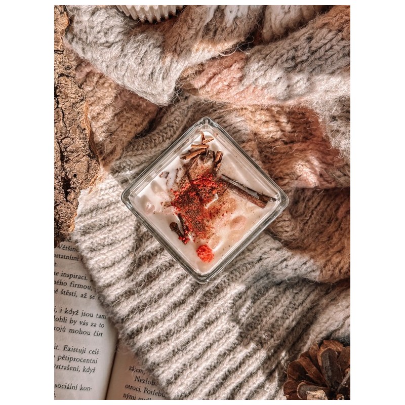 100% přírodní sójová svíčka s minerálním překvapením uvnitř a vůní 100% přírodních esenciálních olejů